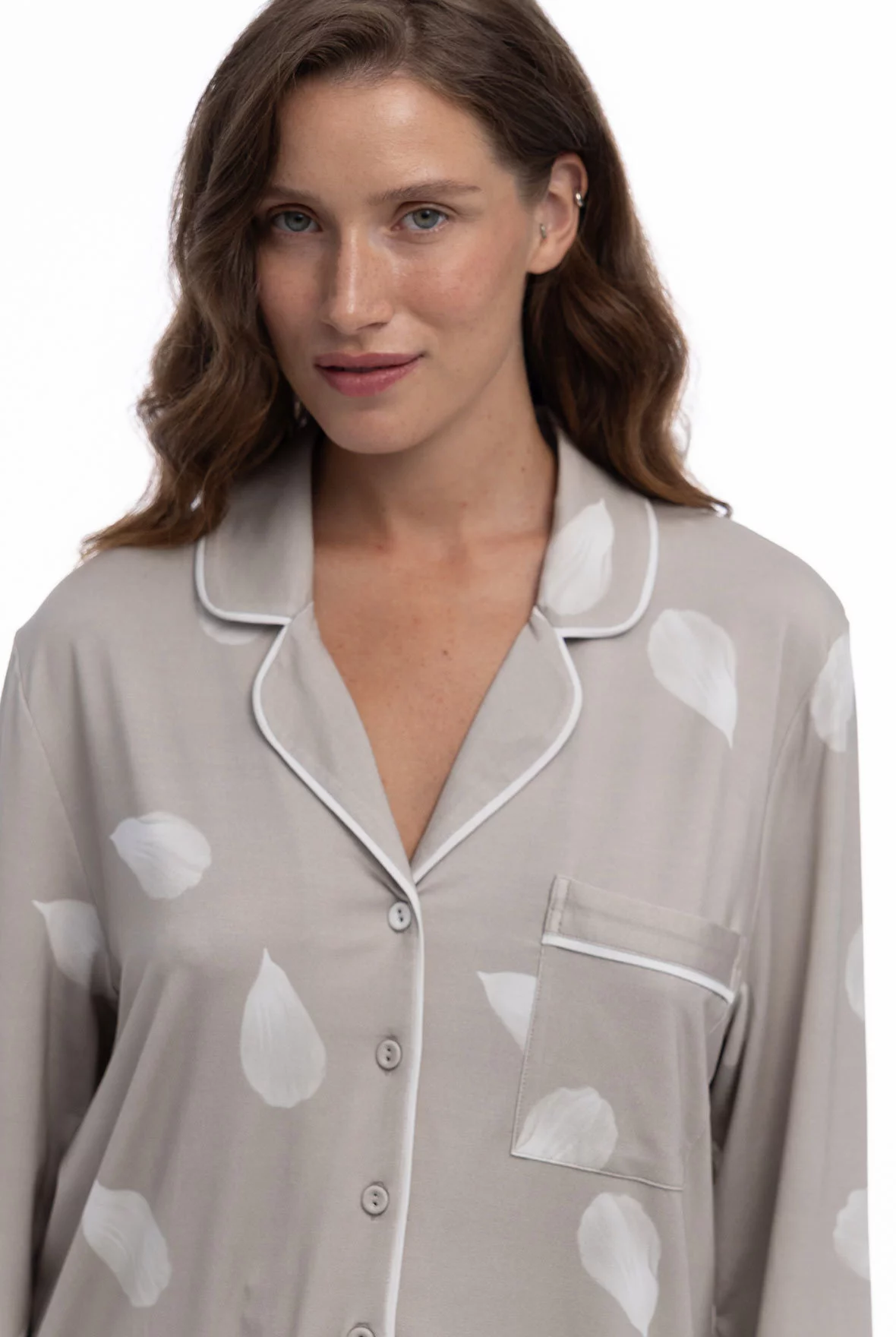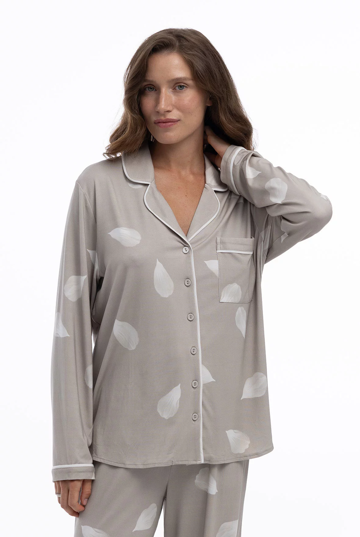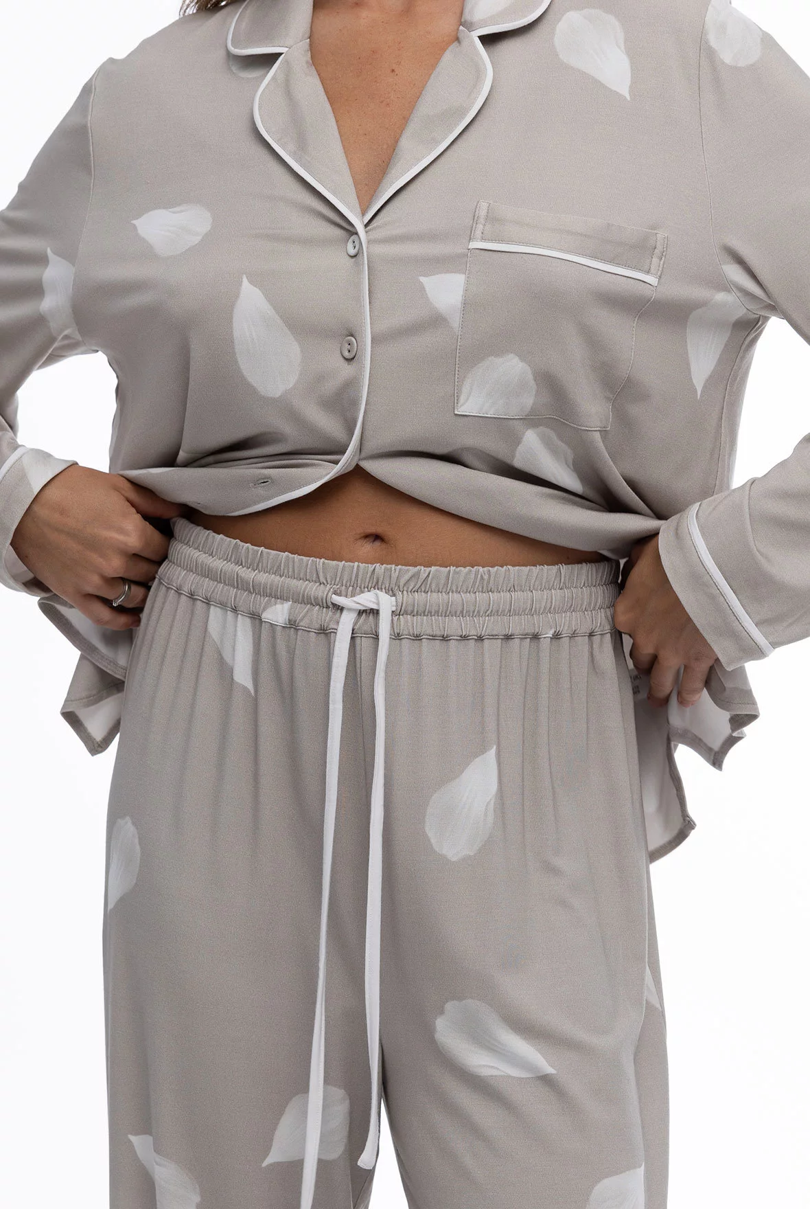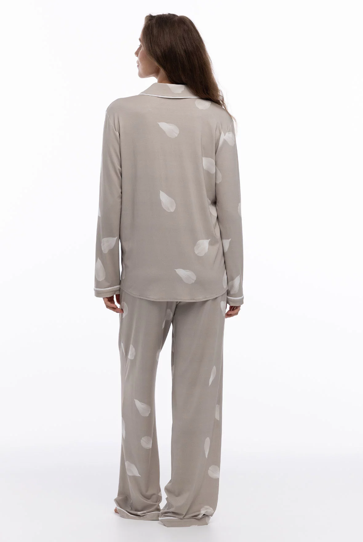 Пижама с рубашкой с длинным рукавом и прямыми брюками с эластичным поясом и контрастным шнурком. Контрастный кант и пуговицы обтянутые основной тканью коллекции придают образу завершённость.