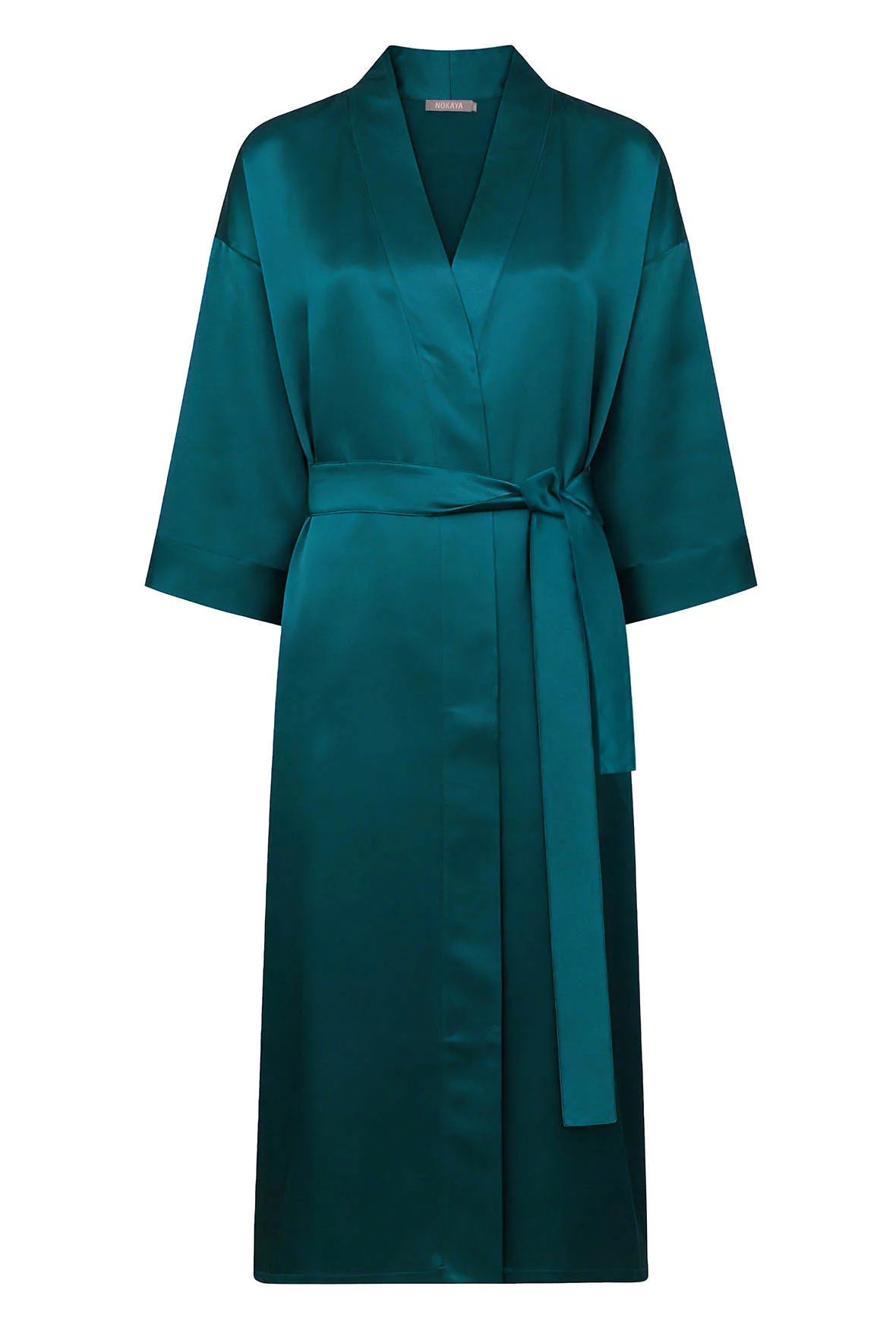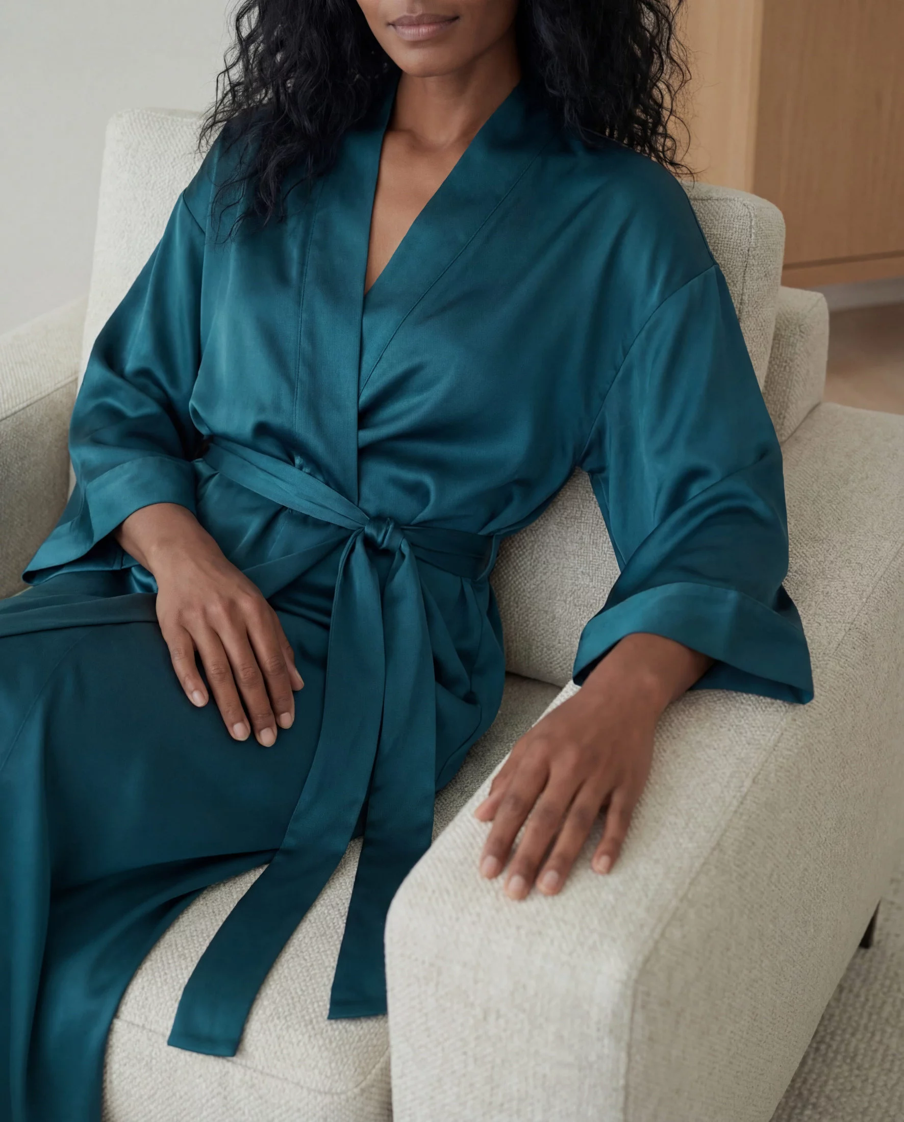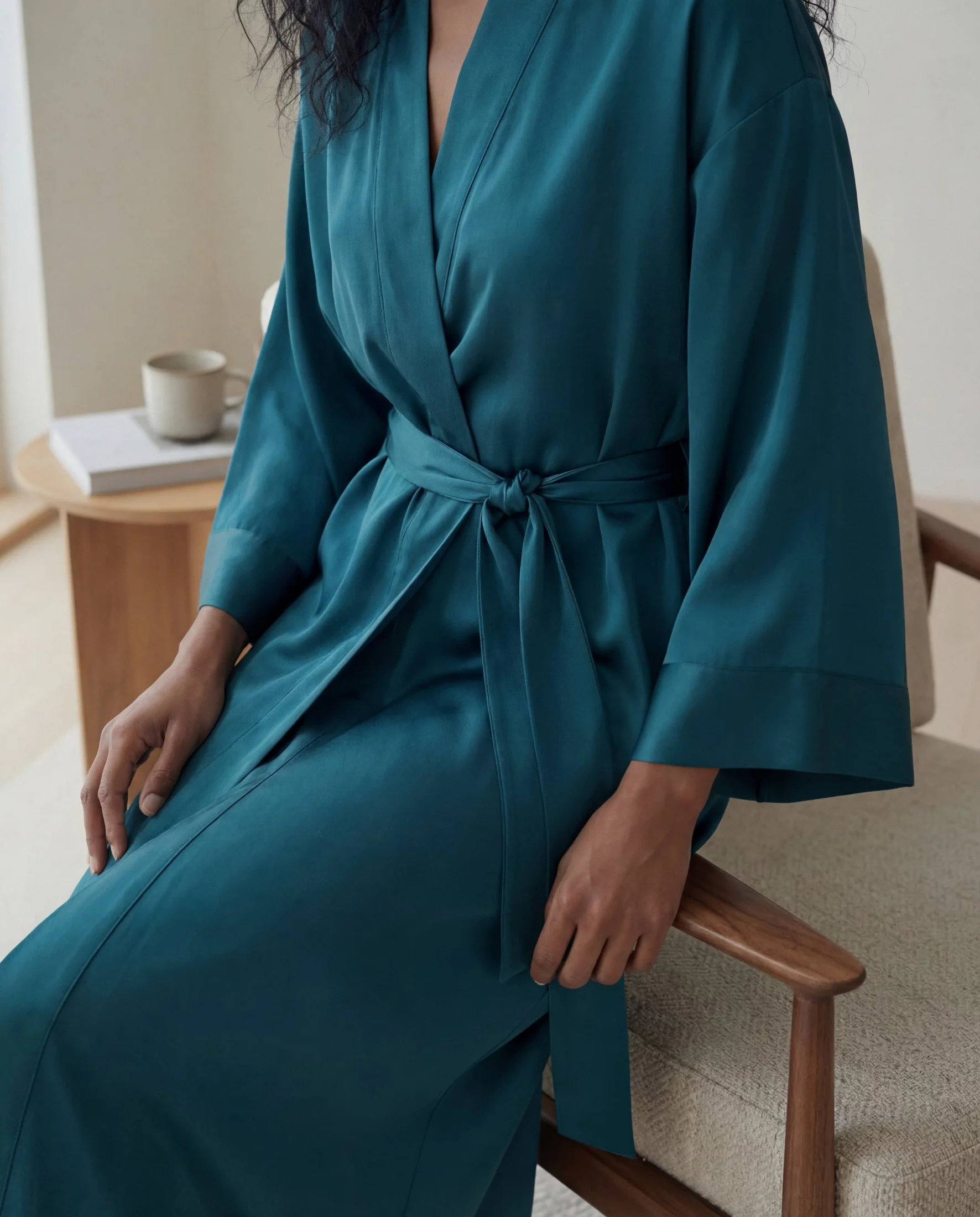 Длинный халат-кимоно с роскошными рукавами и поясом формирует изящный, текучий силуэт. Боковые карманы добавляют функциональность.