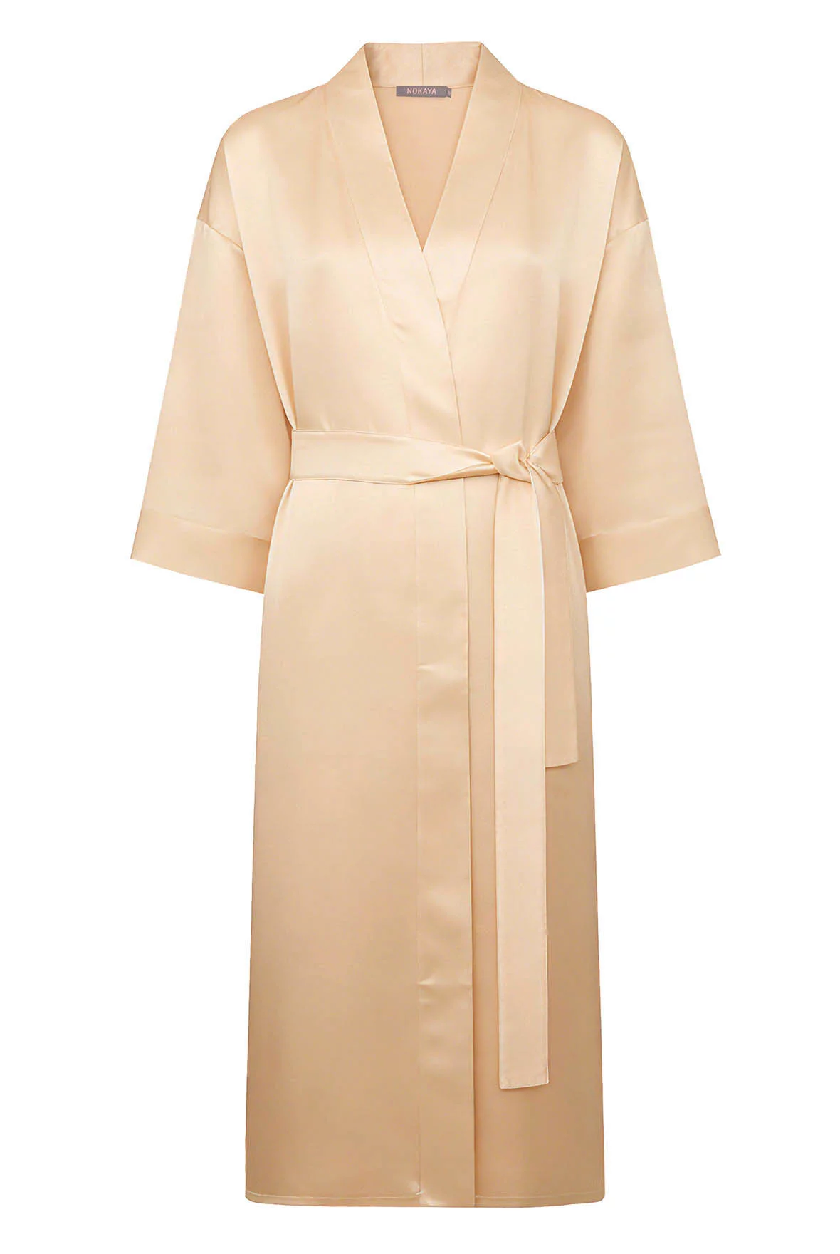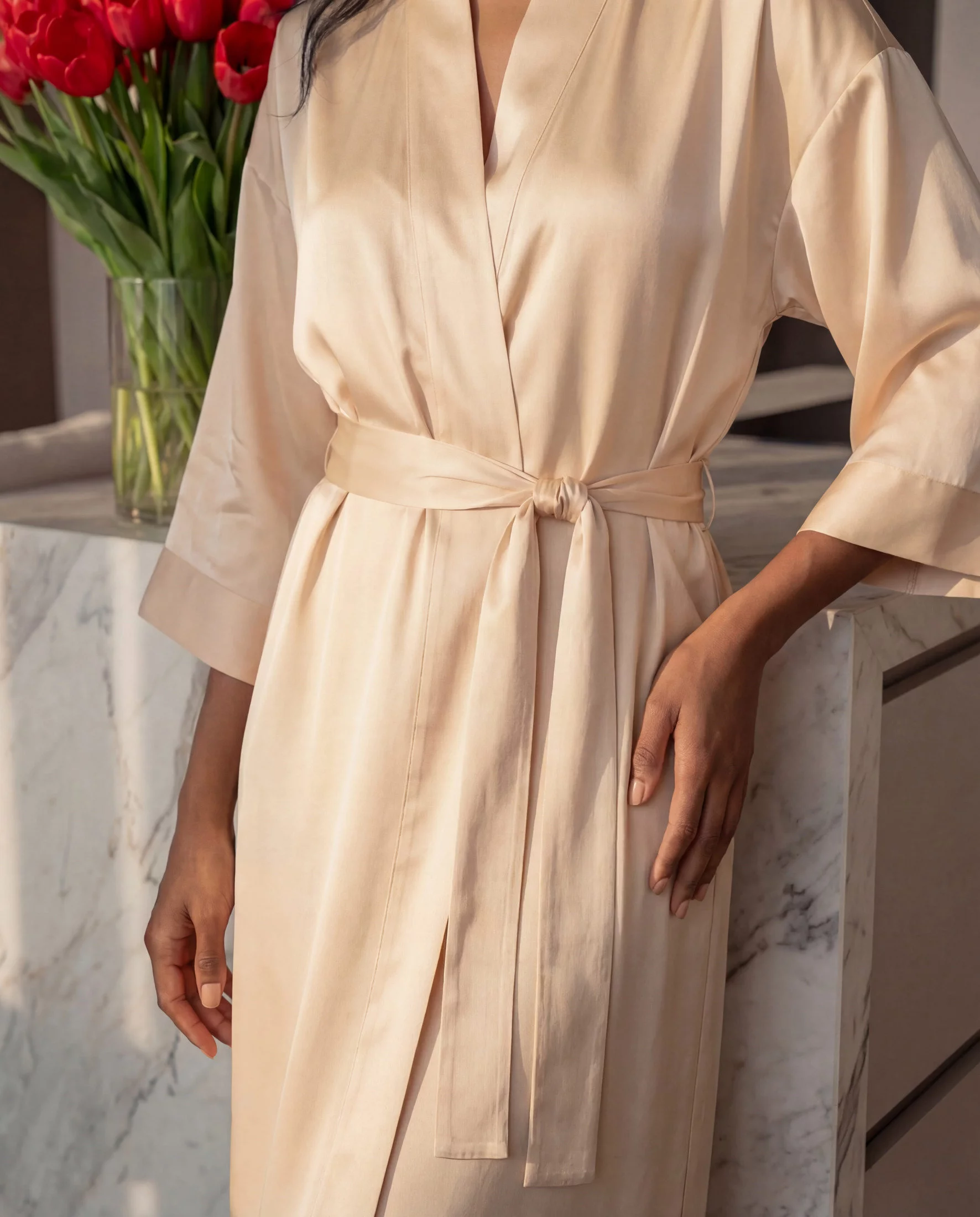 Длинный халат-кимоно с роскошными рукавами и поясом формирует женственный, расслабленный силуэт. Карманы добавляют практичность, сохраняя чистоту линий.