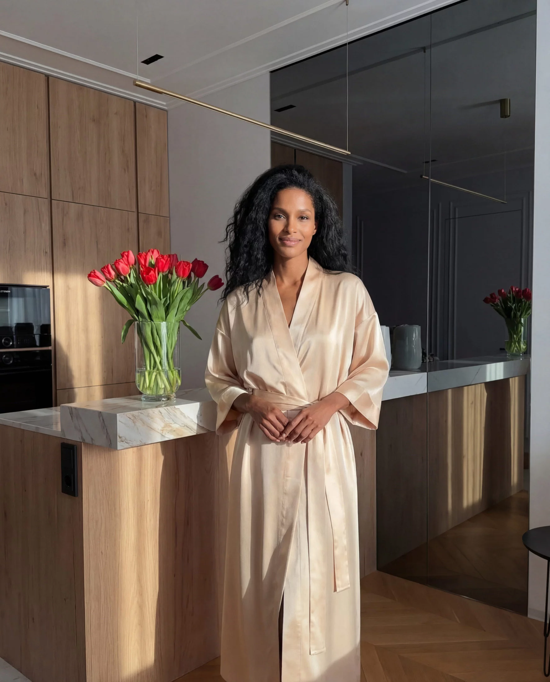 Тёплый карамельный оттенок подчёркивает естественное сияние шелка и делает образ особенно уютным и элегантным.