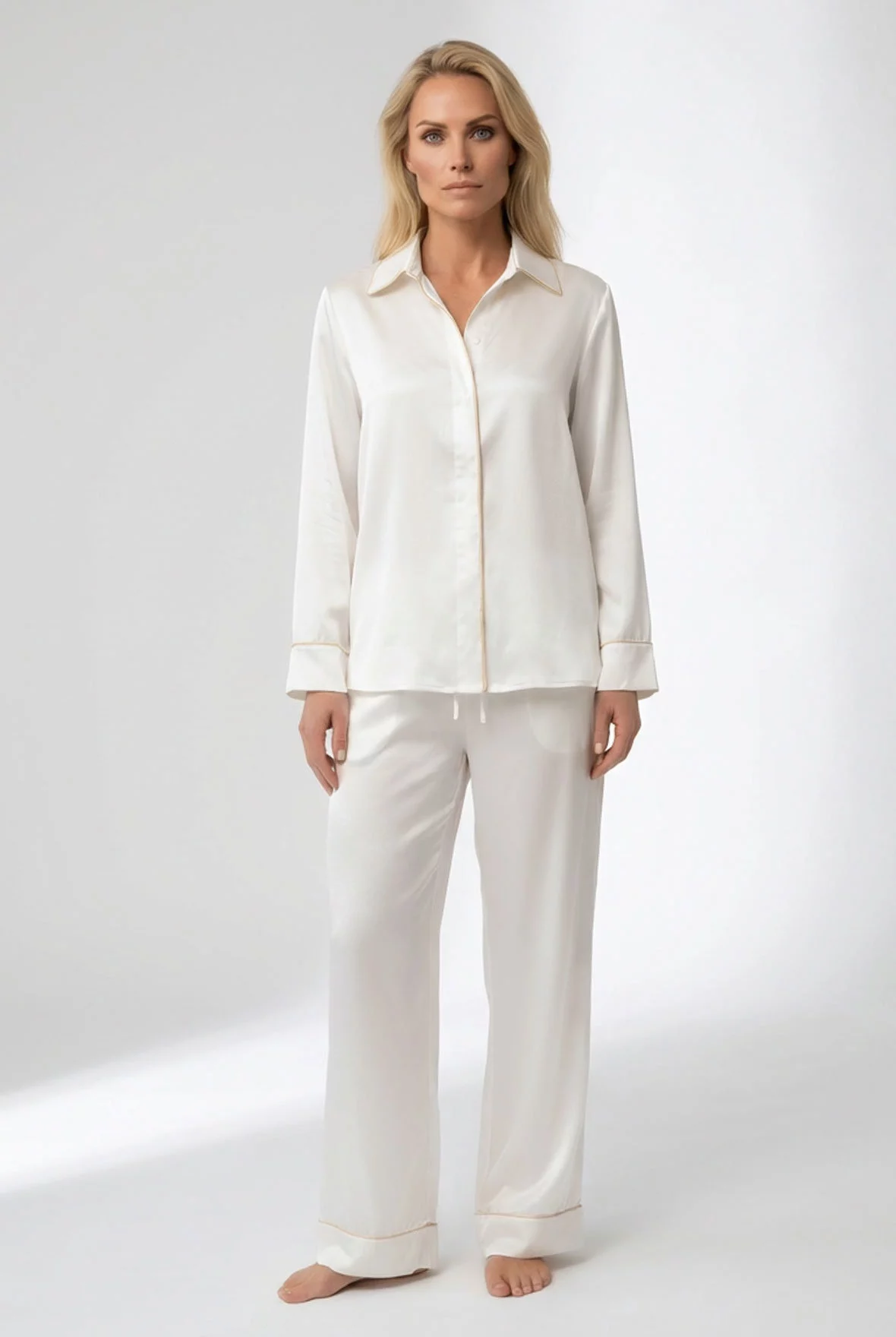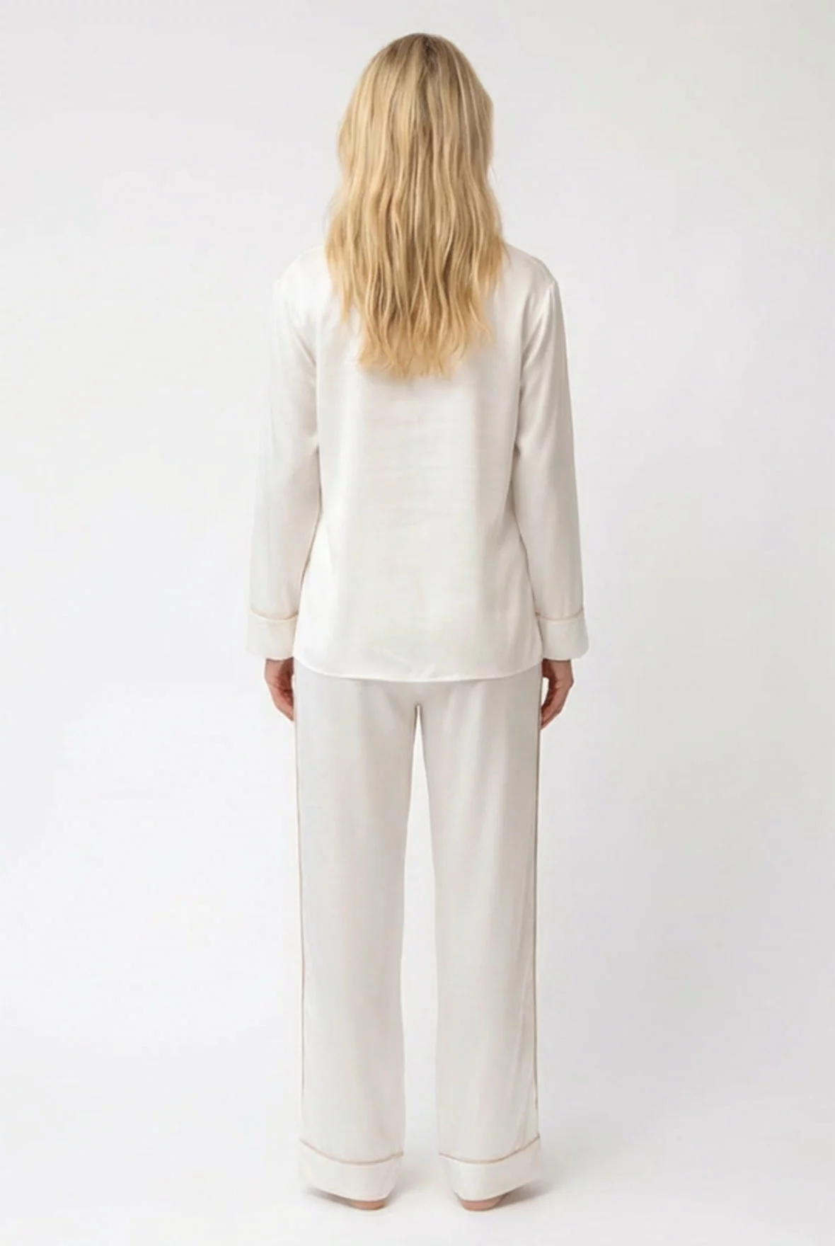 Современное прочтение утончённого шёлкового образа. Пижама The Lady в оттенке Ivory выполнена из 100% Mulberry silk: чистого, светящегося и по-настоящему роскошного, самого благородного цвета коллекции. Струящаяся рубашка и мягко драпирующиеся брюки формируют элегантный силуэт, подчеркнутый контрастным кантом карамельного оттенка — точным и сдержанным акцентом. Пуговицами из перламутра с логотипом Nokaya, которые деликатно отражают свет и подчёркивают. Комплект упакован в фирменной подарочной коробке Nokaya, комплимент для данного цветового решения.